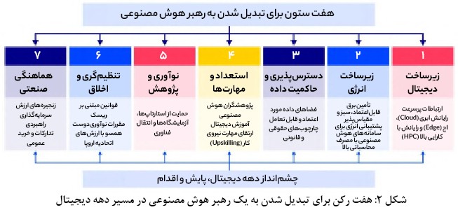 ایجاد رهبری برای اتحادیه اروپا و قرار دادن اروپا به عنوان یک قاره واقعی هوش مصنوعی، اولویت اصلی است و نیاز به مجموعه‌ای جامع از دارایی‌ها، قابلیت‌ها و زیرساخت‌ها – از مهارت‌های پیشرفته گرفته تا چارچوب‌های اخلاقی قوی – دارد، همانطور که در شکل ۲ نشان داده شده است. این شامل زیرساخت‌های دیجیتال بسیار کارآمد – از اتصال گرفته تا محاسبات کوانتومی – برای پشتیبانی از موج فعلی نوآوری در هوش مصنوعی است. افزایش قابل توجه قدرت محاسباتی، ذخیره‌سازی داده‌ها و اتصال سریع، ایمن و با تأخیر کم نیز برای آموزش مدل‌های پایه و توسعه برنامه‌های کاربردی هوش مصنوعی یکپارچه عمودی ضروری است.