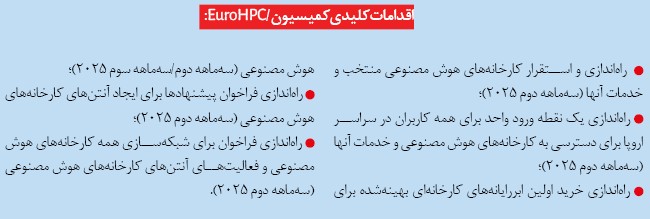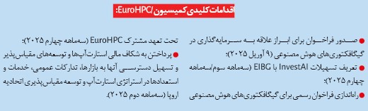 – پس از نتیجه بحث‌ها در فراخوان‌های اولیه ابراز علاقه با طرف‌های ذینفع، از جمله کشورهای عضو، صنعت و موسسات مالی، فراخوان رسمی برای تاسیس گیگافکتوری‌های هوش مصنوعی در سه‌ماهه چهارم ۲۰۲۵ توسط شرکت مشترک EuroHPC منتشر خواهد شد.