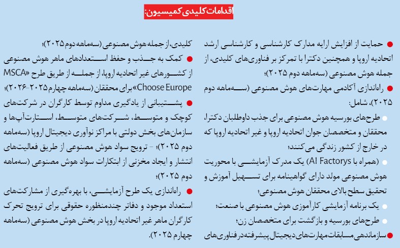 اتحادیه اروپا باید مجموعه استعدادهای هوش مصنوعی خود را گسترش دهد تا بتواند با تقاضای فزاینده برای تخصص‌های مرتبط با هوش مصنوعی، به ویژه در رابطه با توسعه برنامه‌های کاربردی هوش مصنوعی و مهارت‌های خاص صنعت، همگام شود. کمیسیون این کار را با تمرکز بر موارد زیر انجام خواهد داد: