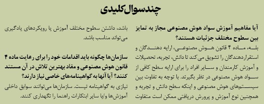 • یکی از ابتکارات قانون جامع هوش مصنوعی اروپا الزام برای ارتقا «سواد هوش مصنوعی» در میان استقرار دهندگان، کارکنان و مخاطبان است. ماده 4 این قانون صراحتا بر این موضوع تاکید دارد و الزامات و دستورالعمل هایی نیز در این زمینه آماده و اجرا شده است.